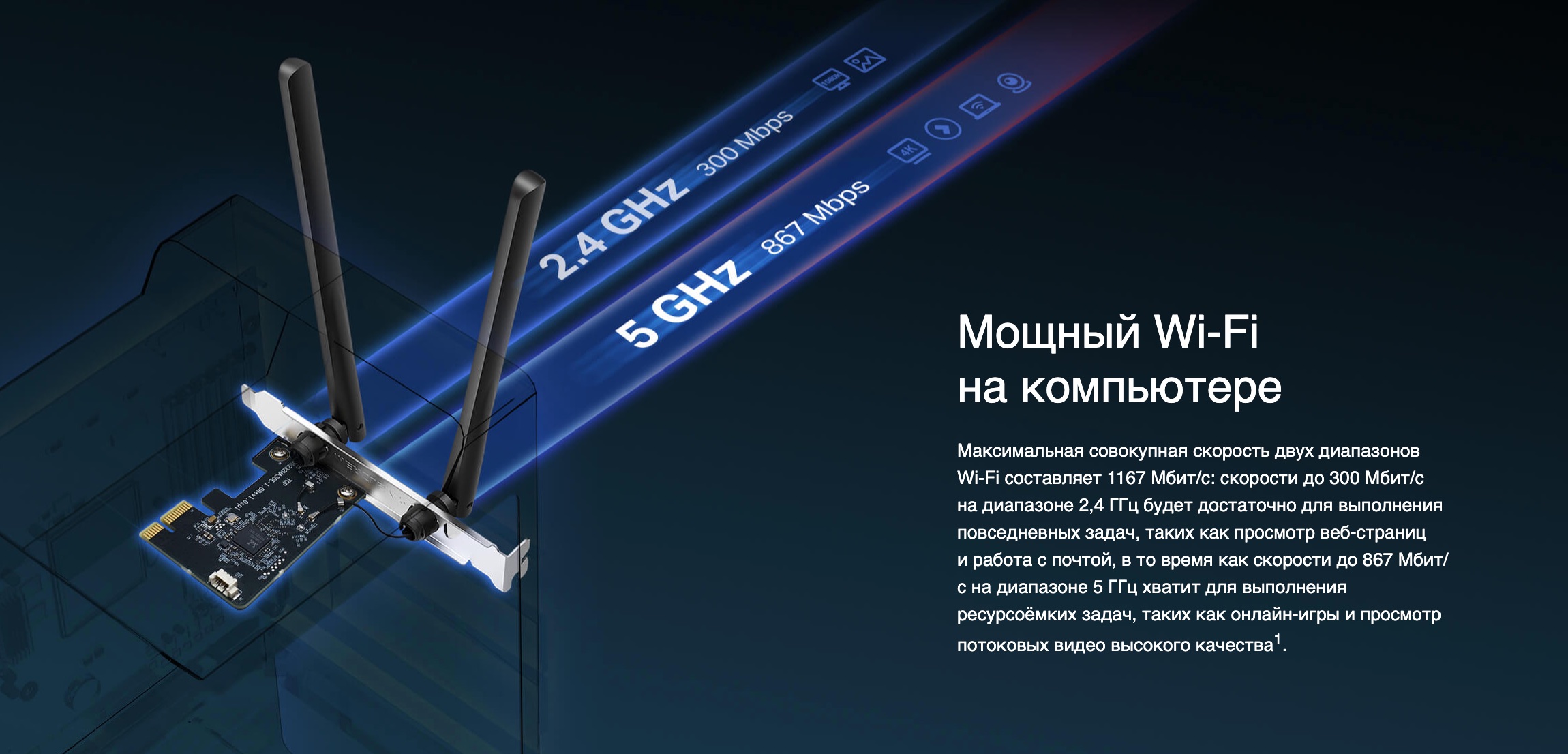 - Два диапазона Wi‑Fi: до 300 Мбит/с (2,4 ГГц) + до 867 Мбит/с (5 ГГц)1.