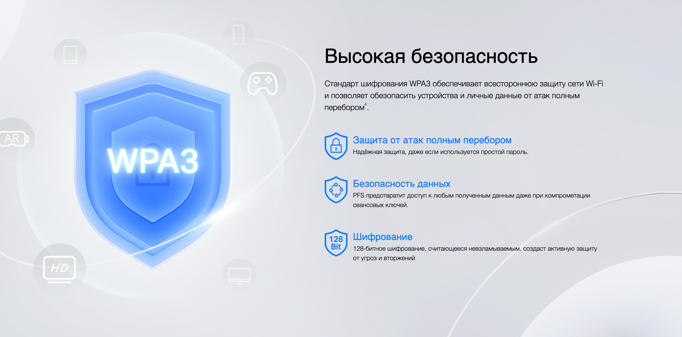 - Повышенная безопасность: стандарт шифрования WPA3 обеспечит надёжную защиту паролей4.