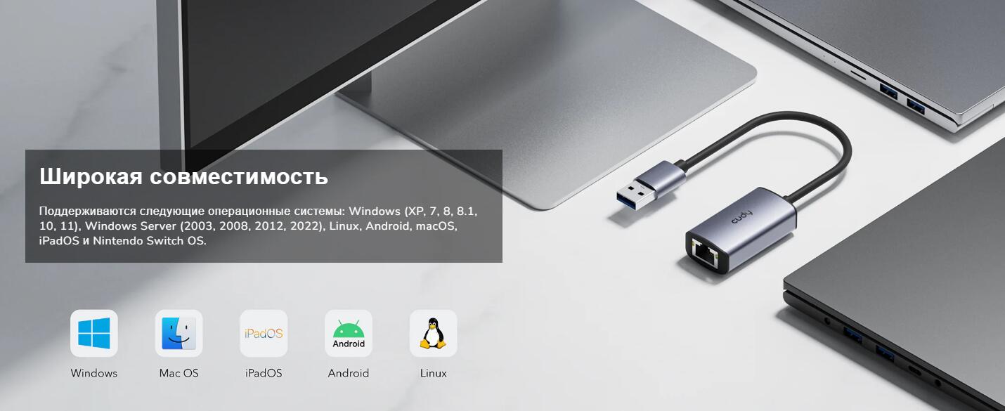 Широкая поддержка операционных систем включает не только актуальные Windows 11, 10, macOS и Linux, но и более старые версии, такие как Windows XP и Windows Server 2003, что делает адаптер универсальным решением для устаревшего, но все еще используемого оборудования.