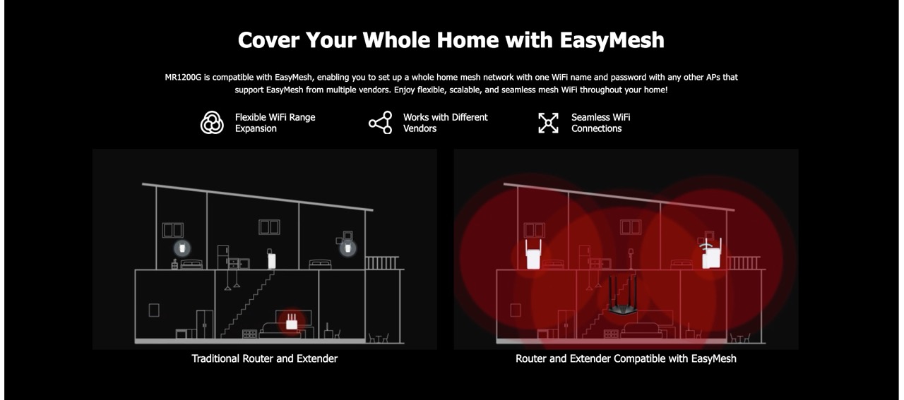 • Совместимость с EasyMesh: роутер работает с маршрутизаторами и усилителями сигнала EasyMesh, формируя бесшовную домашнюю Mesh-сеть WiFi, предотвращая сбои и задержки при переходе между источниками сигнала.