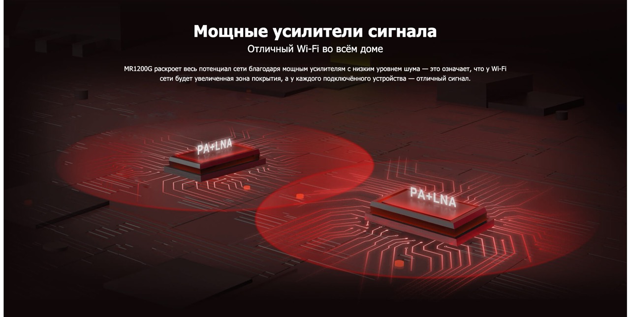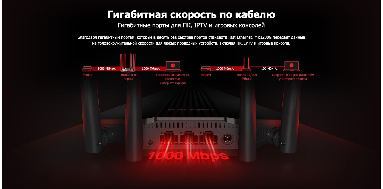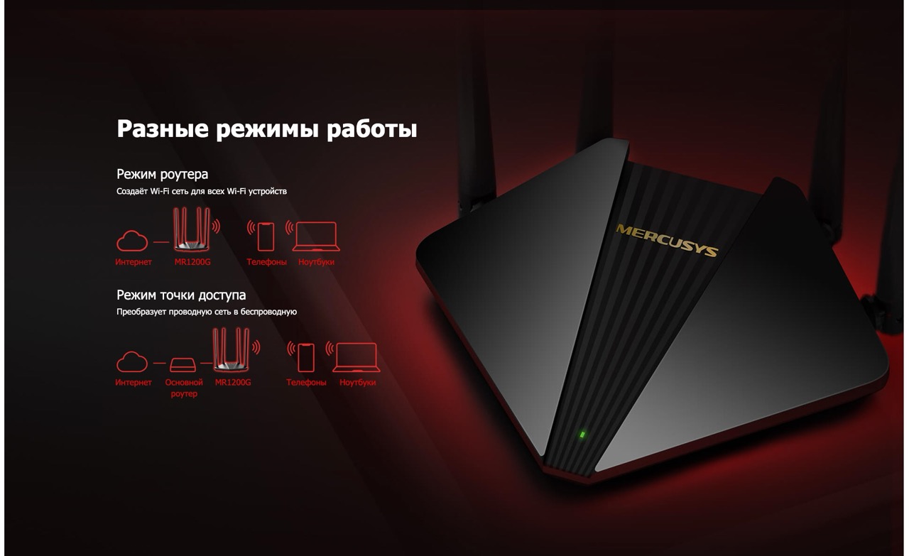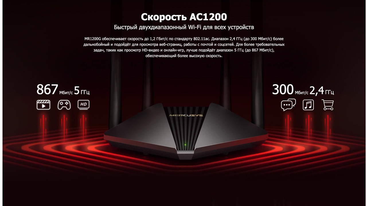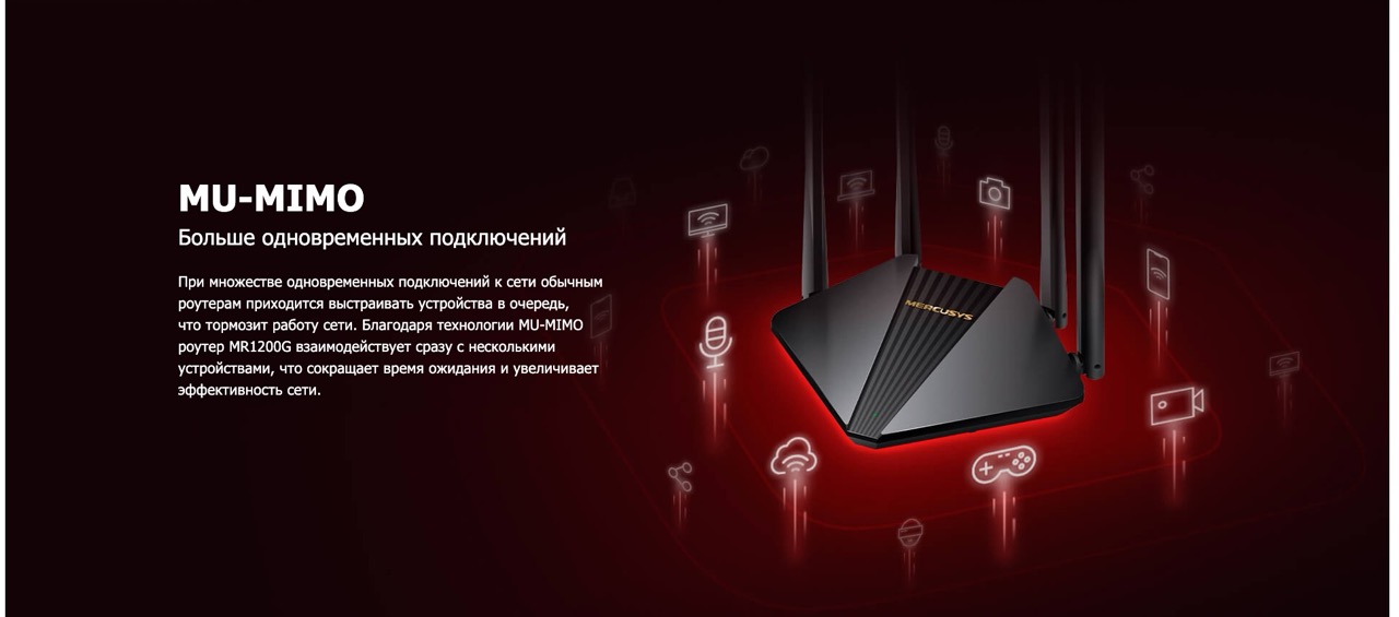 • Высокая эффективность сети — технология MU‑MIMO позволяет MR1200G взаимодействовать сразу с несколькими устройствами, что увеличивает общую пропускную способность сети