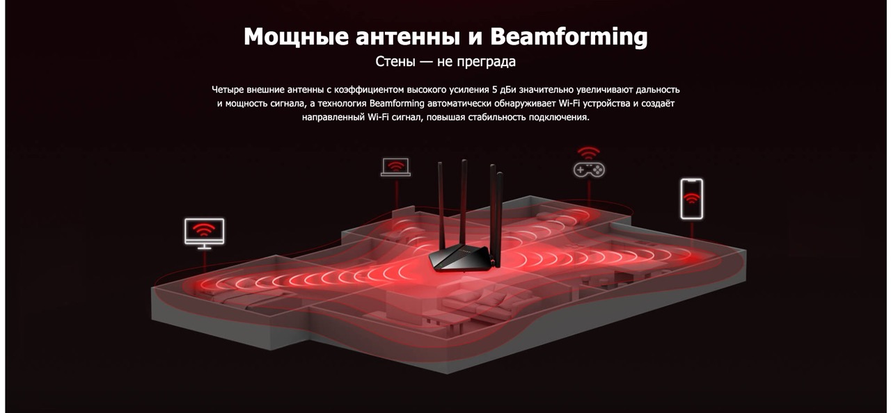 • Широкое покрытие — благодаря четырём антеннам с высоким коэффициентом усиления и функции Beamforming стабильное Wi‑Fi подключение будет во всём доме