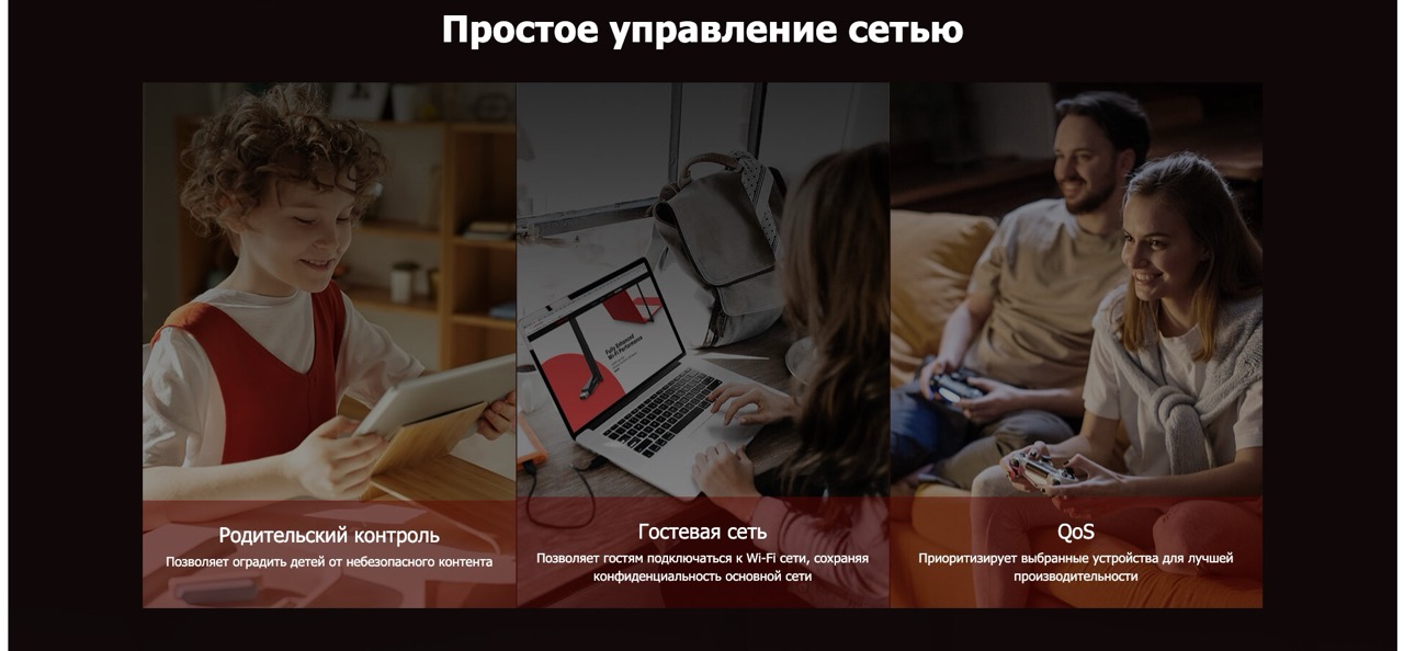 • Простое управление домашней сетью — разнообразные функции, такие как родительский контроль, приоритизация (QoS) и гостевая сеть для повышения безопасности и эффективности
