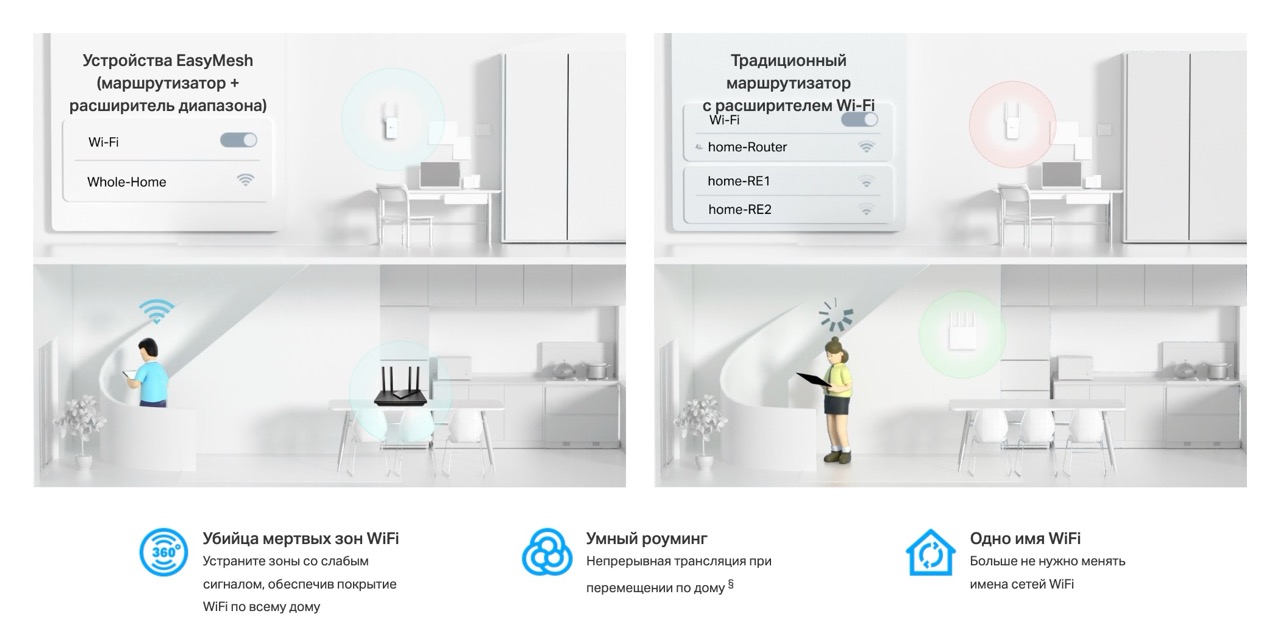 Совместимость с EasyMesh: позволяет гибко создавать Mesh-сеть, подключаясь к маршрутизатору, совместимому с EasyMesh, для бесперебойного покрытия всего дома.