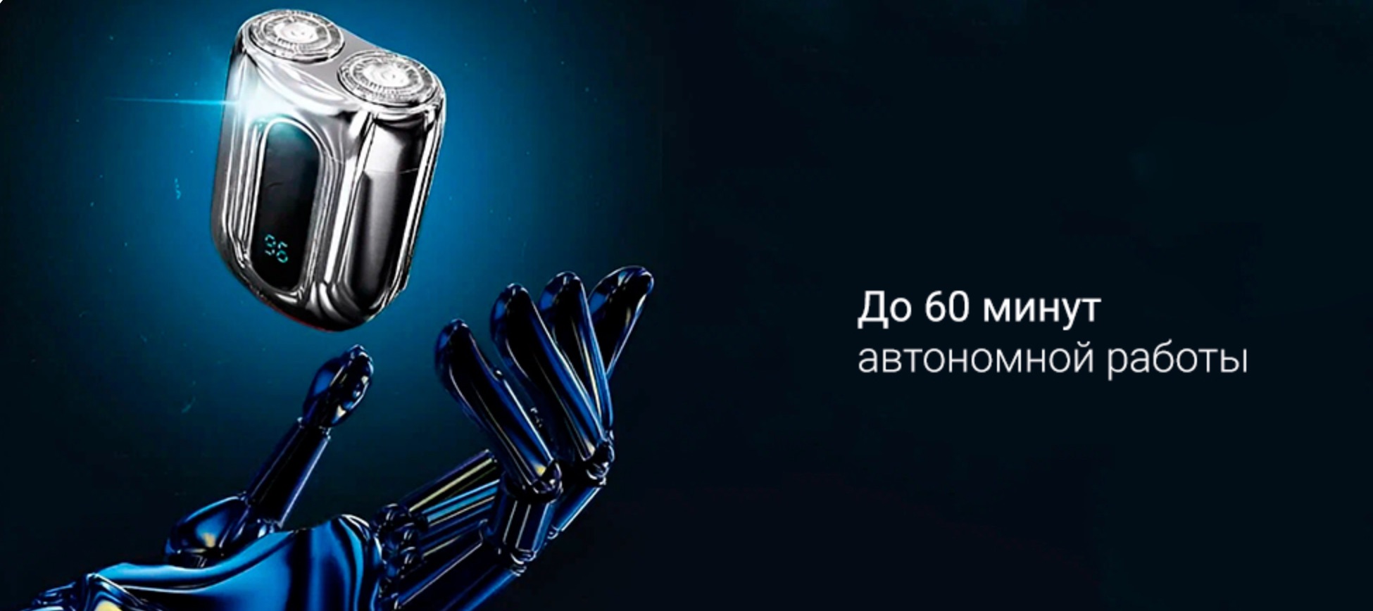 Устройство оснащено встроенным аккумулятором, обеспечивающим до 60 минут автономной работы без подзарядки. Компактные размеры делают бритву удобной для использования одной рукой и идеальной для поездок.