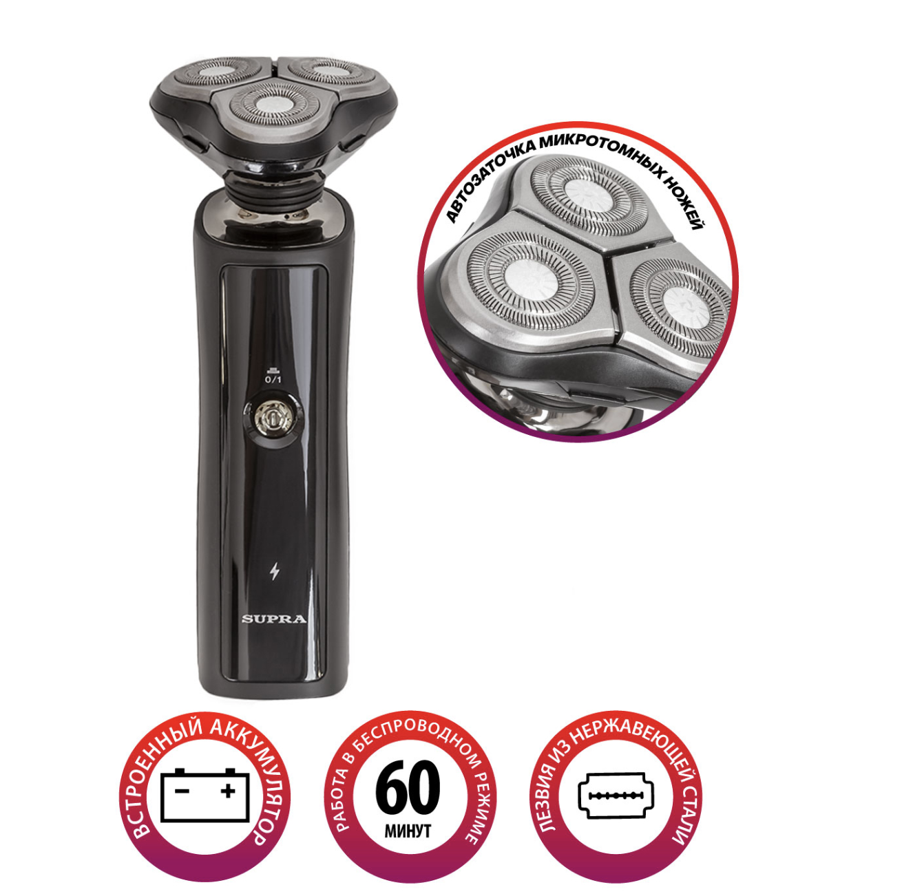 БрендSupra Тип бритвыРоторный Количество бритвенных головок/сеток3 Количество скоростей1 Время автономной работы60 мин Питание бритвыОт аккумулятора Информационный дисплейНет Особенности бритвыИндикатор зарядки, Очистка под проточной водой, Плавающая головка