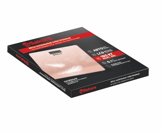 Весы напольные электронные, 180 кг, цена деления 100 г, ультратонкий корпус из закаленного стекла (толщ.6мм), размеры весов 300х300х18 мм, ЖК дисплей, вкл. прикосновением, автоотключение, индикатор перегрузки и заряда батарейки, питание 1*CR2032, рисунок: перья.