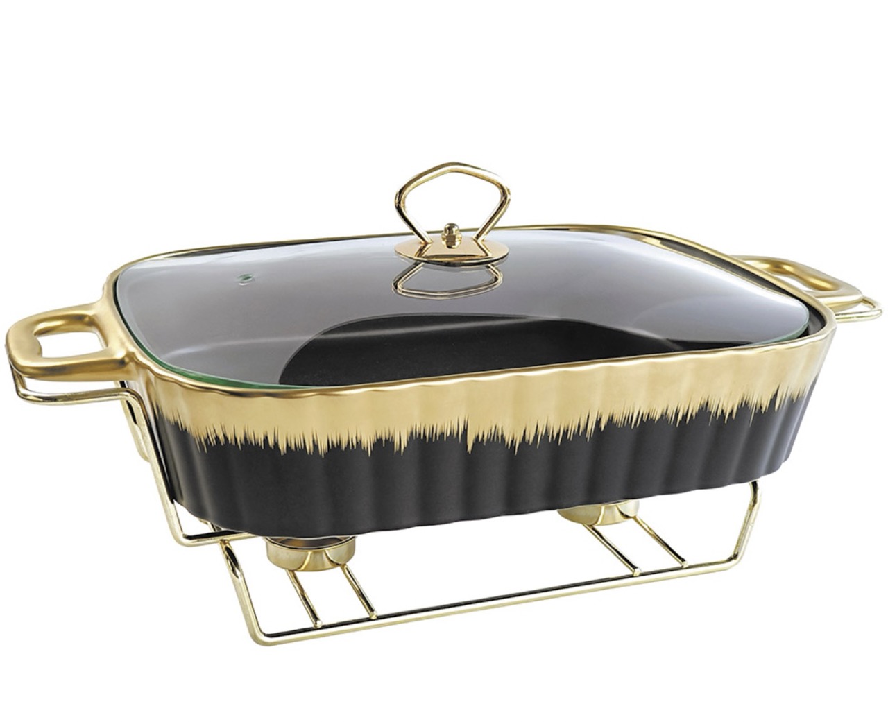 Мармит настольный с подогревом, материал – жаропрочная керамика с декором «под золото», 2,0 литра (32 см), металлическая подставка с двумя подсвечниками "под золото", крышка из жаропрочного стекла, предназначен для сохранения пищи в подогретом виде, подходит для использования в духовом шкафу.